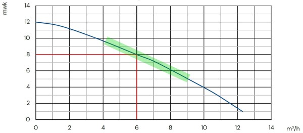 Het is best dat de pomp in het middelste derde van de curve gebruikt wordt (het groene deel).